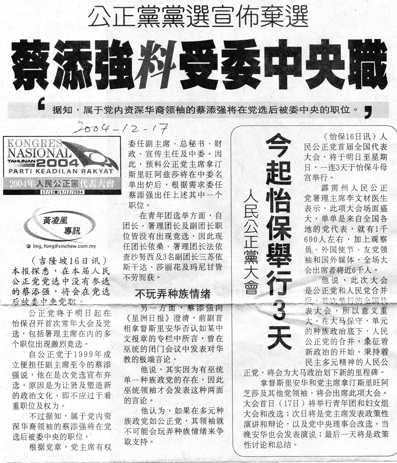 我真诚期望获选的同志们,毅然接受和负起党所给予的一切委托与任务,共同探讨、勇于创新,以落实党和人民的斗争目标。我也希望胜者莫骄,败者也不气绥。无论胜负,这是党内民主生活的文化党选后大家还是同志。党需要团结所有的力量,以实现党的斗争目标。