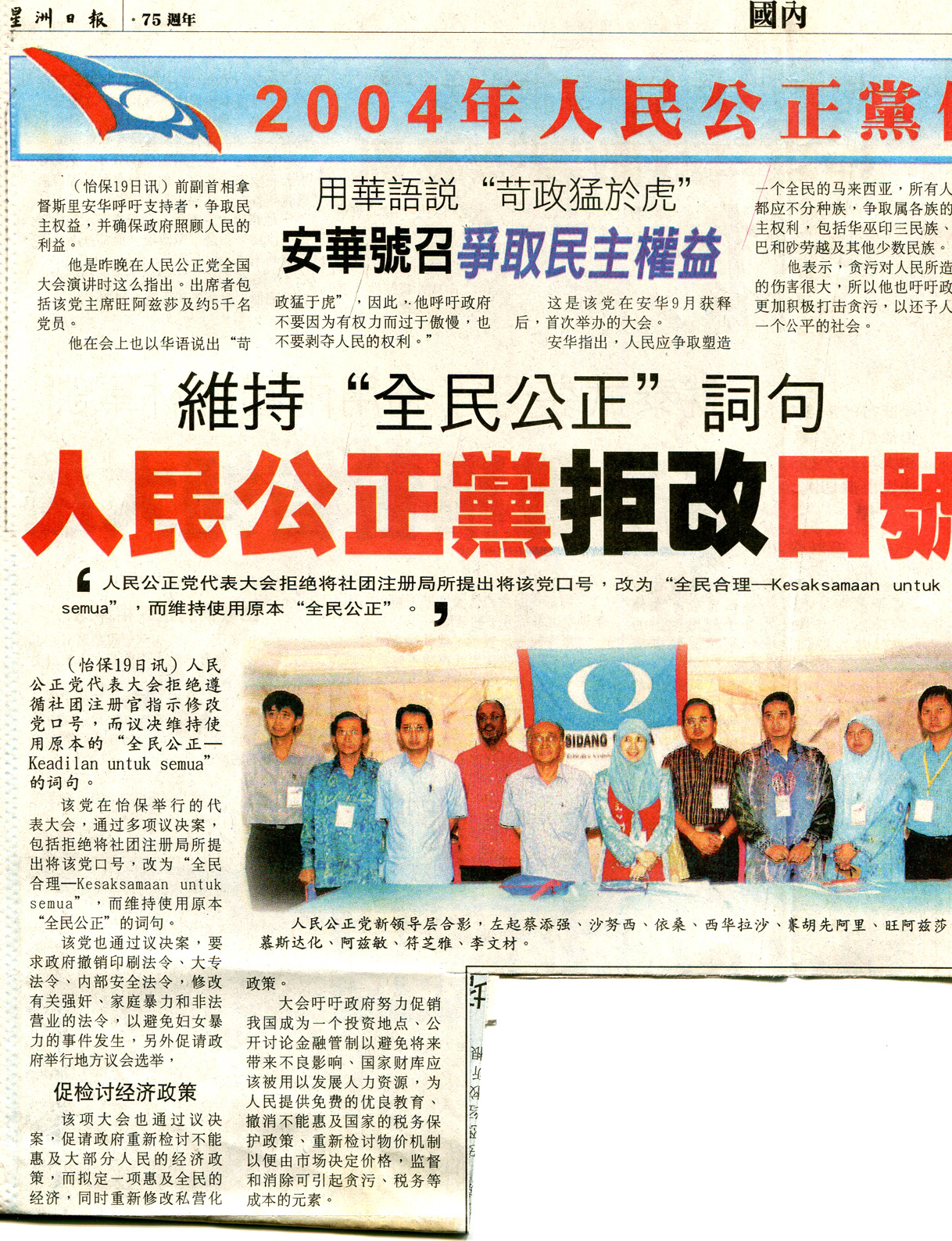 2004年12一月18日,党第一届全国代表大会,历史性地在吡叻州怡保市的斗母宫成功举行。党主席旺阿芝莎为大会主持了开幕礼,以下是她致词的摘要: